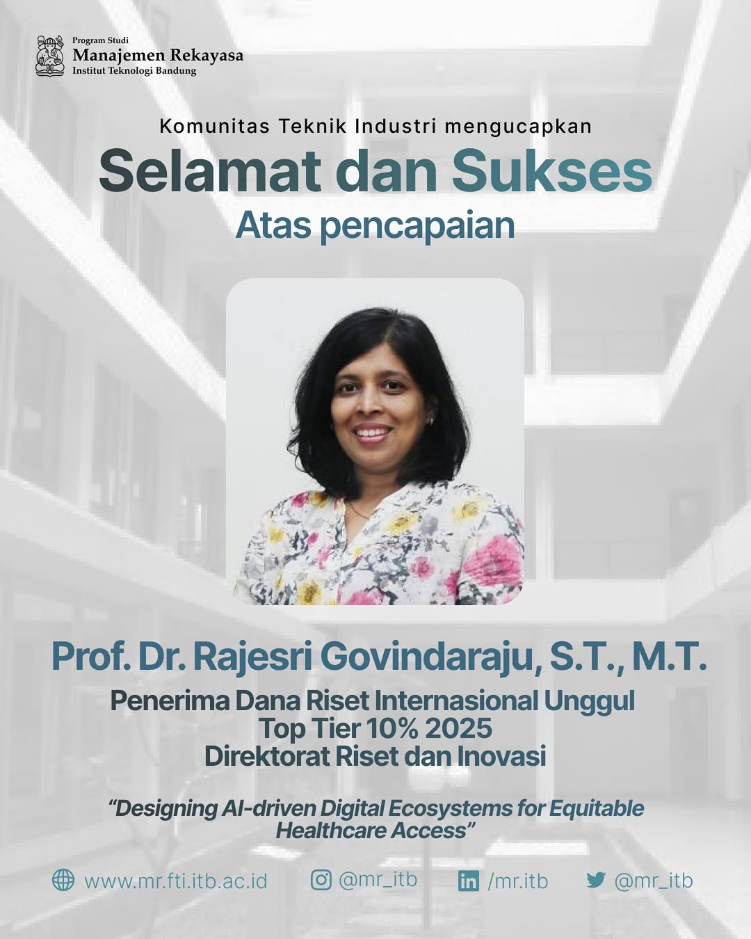 The Industrial Engineering Community of ITB extends its heartfelt congratulations to Prof. Dr. Rajesri Govindaraju, S.T., M.T. for her outstanding achievement as a Recipient of the 2025 Top Tier 10% International Research Grant from the Directorate of Research and Innovation, Institut Teknologi Bandung (ITB) with the research title: