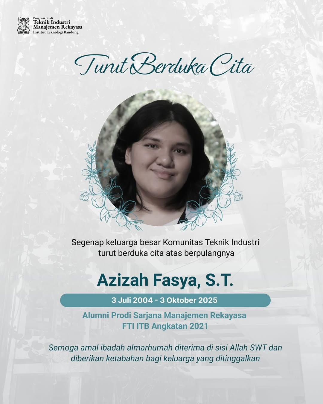 Ucapan Belasungkawa atas Berpulangnya Azizah Fasya, S.T.