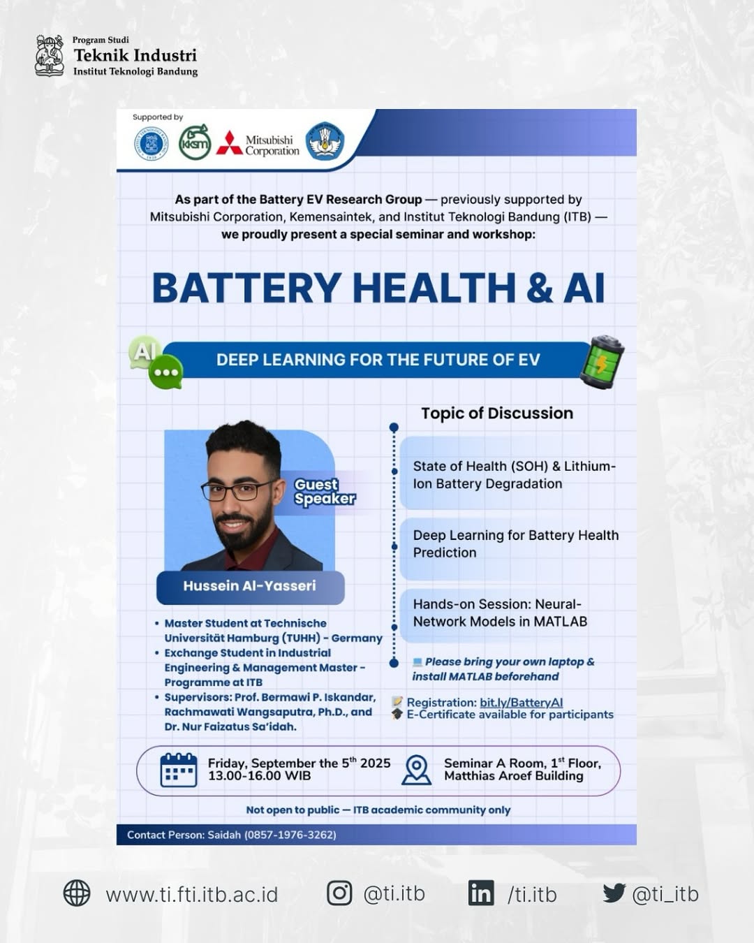 ๐ŸŽค Speaker: Hussein Al-Yasseri โ€” Masterโ€™s Student at Technische Universitรคt Hamburg (TUHH), Germany; Exchange Student in Industrial Engineering & Management Master Programme at ITB, conducting joint research on EV Battery Health and AI under the supervision of Prof. Bermawi P. Iskandar, Rachmawati Wangsaputra, Ph.D., and Dr. Nur Faizatus Saโ€™idah.